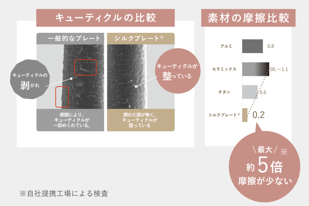プレートが滑らかなため摩擦が少なく、キューティクルを傷めにくいため、滑らかに髪を整えます。髪に自然なツヤを生み出すのが特徴です。
