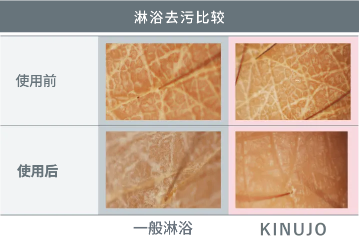将粉底液涂抹在受试者的皮肤表面,然后使用 KINUJO 和普通淋浴的 42 °C 水,检查各种污垢的去除情况。