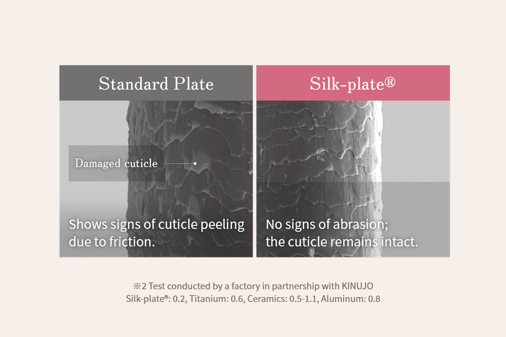 Silk-plate®, with one of the lowest friction coefficients※2, glides smoothly without harming hair.