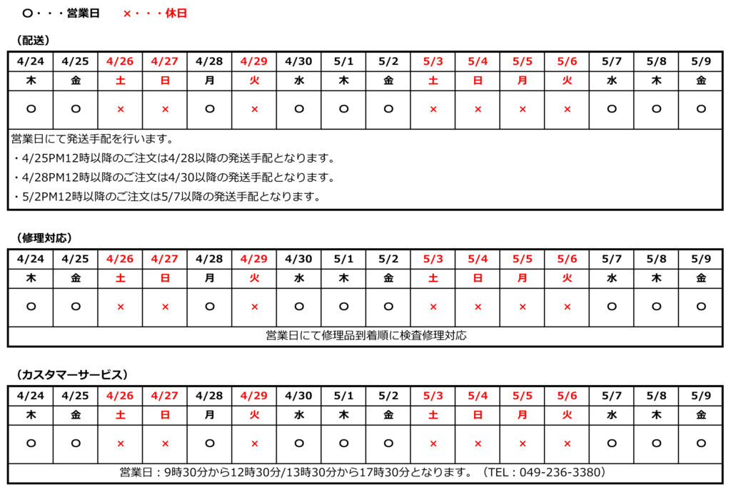 ゴールデンウィーク期間中の営業、及び配送スケジュールをご案内させていただきます。