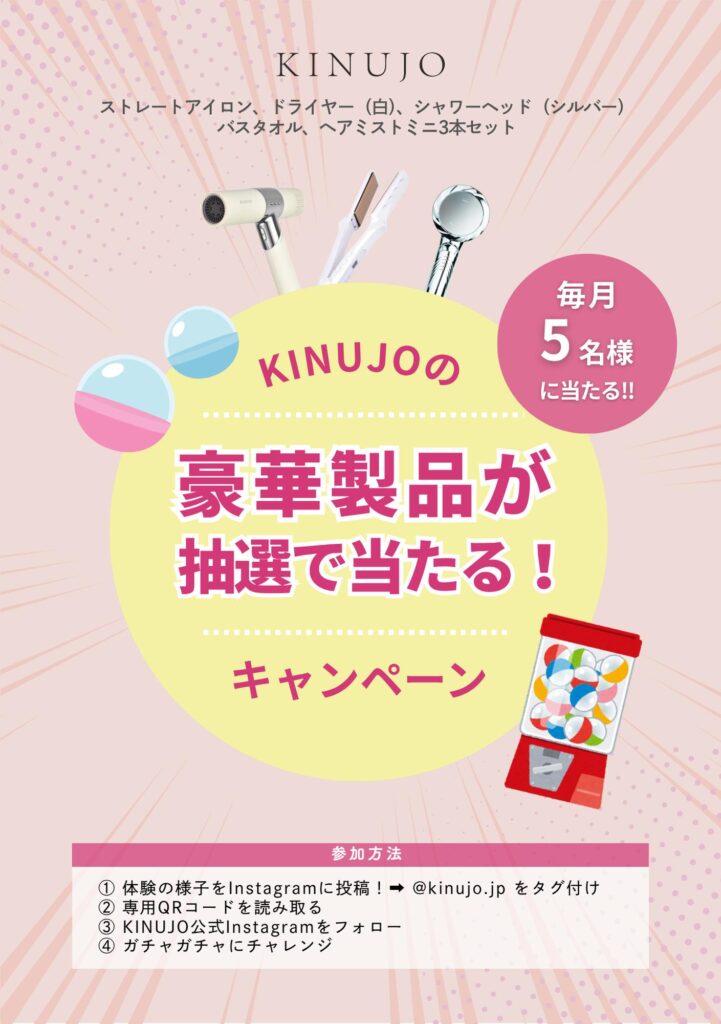 サロンでの体験の様子をInstagramに投稿すると、その場でKINUJOの豪華製品が毎月5名様に当たる抽選に参加できます!