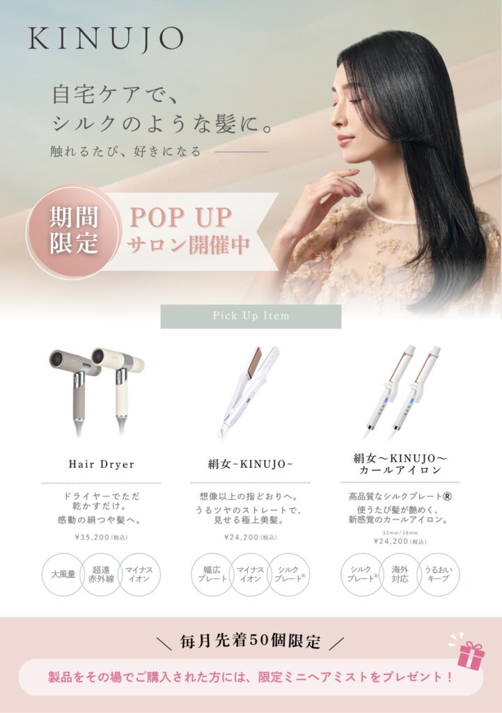 この機会でしか購入できない、特別な『KINUJO ポップアップサロン限定キット』が購入できます。さらに『毎月先着50個 限定』で、ミニヘアミストをプレゼント!