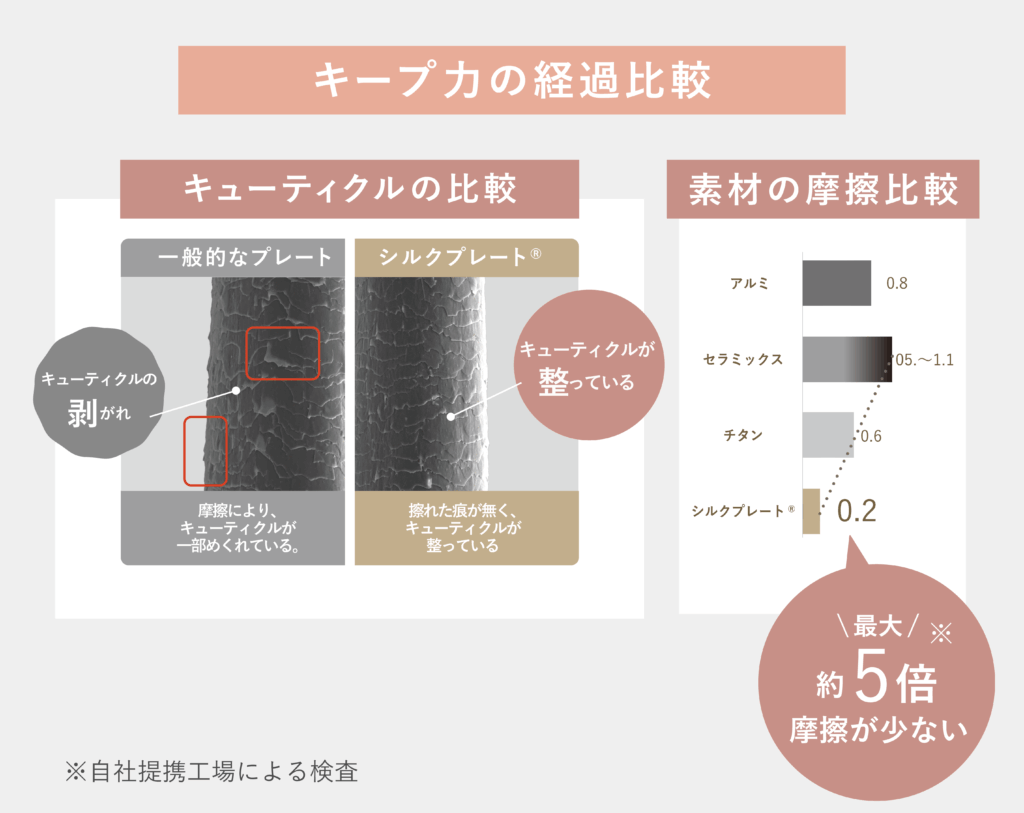 シルクプレート®は髪内部の水分を逃さず、うるおいをキープ。