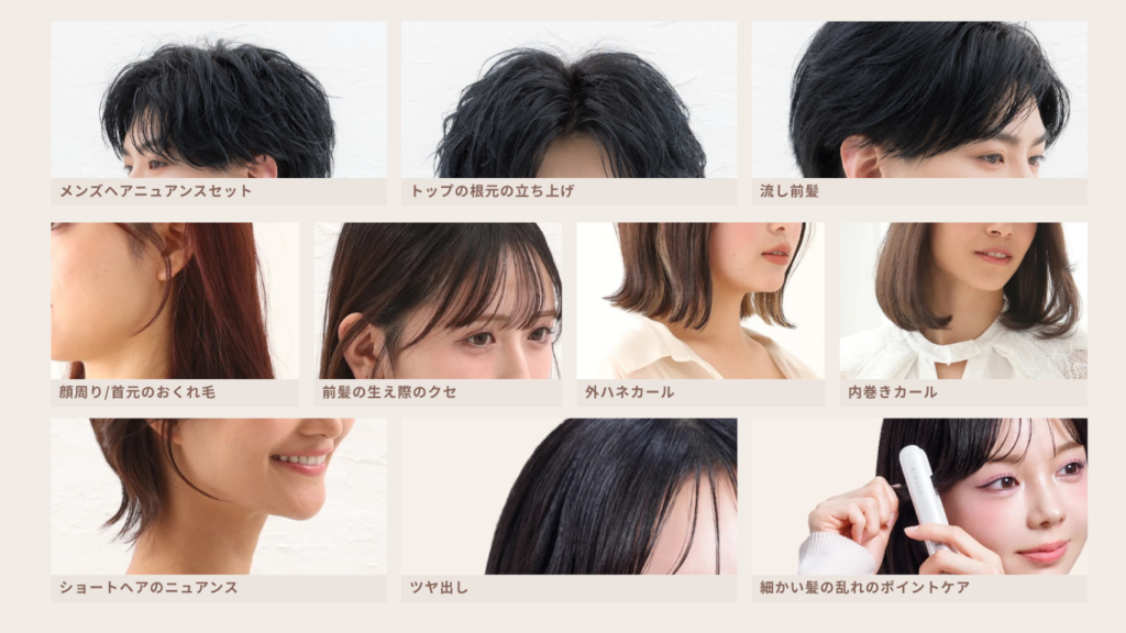 前髪、生え際、襟足、トップの立ち上げ、センターパートの毛流れづくり、さりげない縦波のニュアンス出しまで得意なヘアアイロン。細かい操作がしやすく、初めてでも扱いやすいのが特徴です。