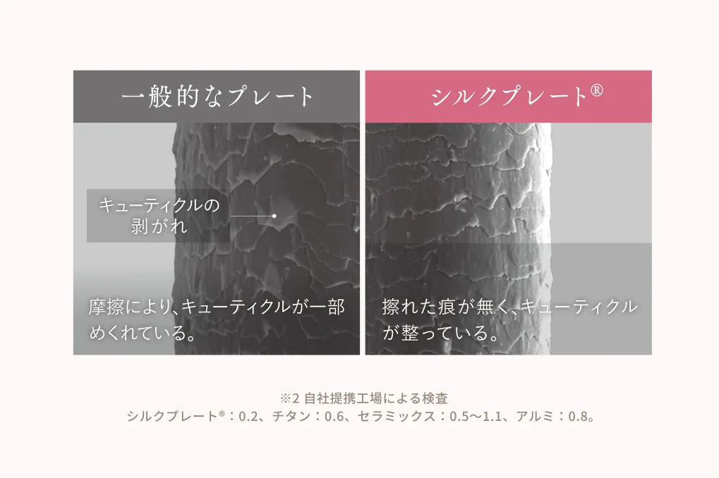 シルクプレート®は、⼀般的なプレート素材の中でも、摩擦による髪への負担※2が少なく、キューティクルを傷めずに、滑らかな使い⼼地を可能にします。