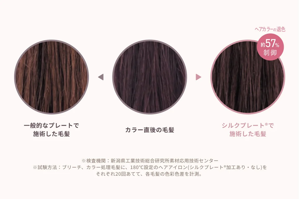 シルクプレート®️は、熱ダメージによる色素破壊やカラー剤の流出を軽減。ヘアカラーの色落ちや退色を抑制し、美しい髪色を長時間キープします。