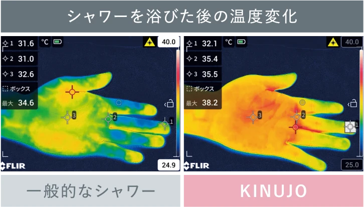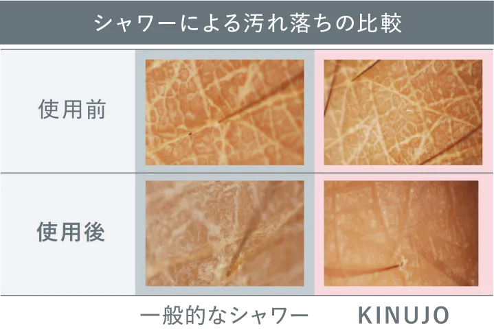 被験者の皮膚表面にファンデーションを塗布。KINUJOと一般的なシャワーから出る42℃のお湯をかけて、それぞれの汚れ落ちを確認。