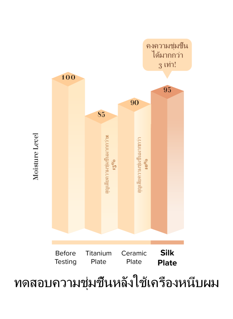 จากการทดสอบความชุ่มชื้นหลังใช้เครื่องหนีบผม พบว่าส่วนมากผมมักจะสูญเสียความชุ่มชื้นประมาณ10-15% แต่หากใช้ SILKPLATE ผมจะเสียความชุ่มชื้นเพียงแค่5% ซึ่งสามารถคงความชุ่มชื้นได้มากกว่าการใช้แผ่นไทเทเนียมหรือเซรามิคถึง 3 เท่า