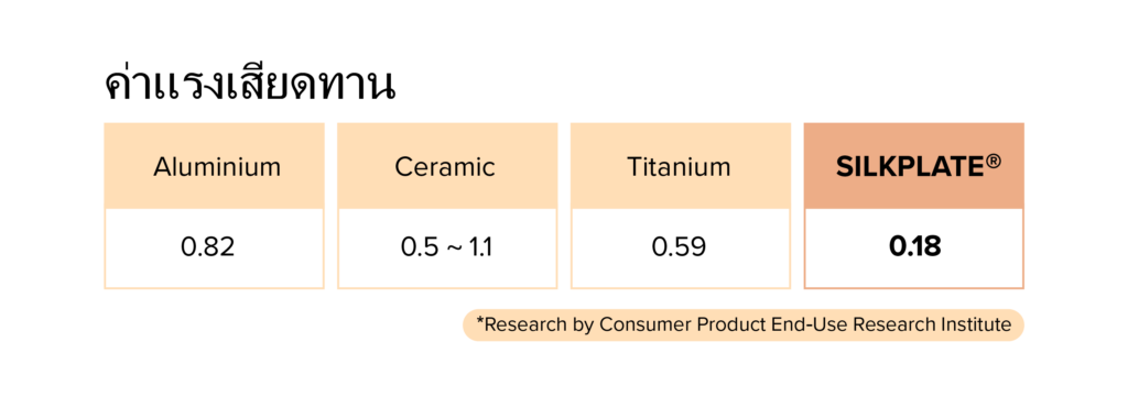 SILKPLATE® ได้ชื่อว่าเป็นวัตถุดิบที่มีแรงเสียดทานน้อยที่สุด เมื่อเทียบกับวัตถุดิบชนิดอื่นๆ และการเสียดสีกับผมที่น้อยลงนี้เอง ที่ช่วยลดความเสียหายของเกล็ดผม ทำให้ผมไม่แห้งกรอบชี้ฟู